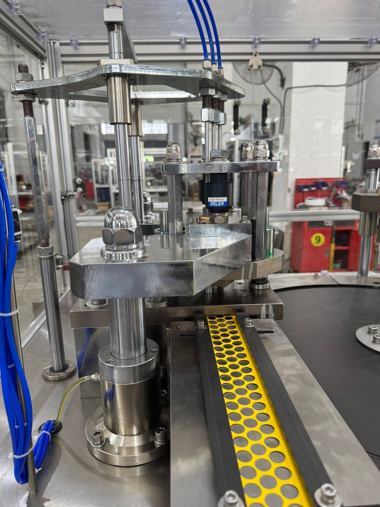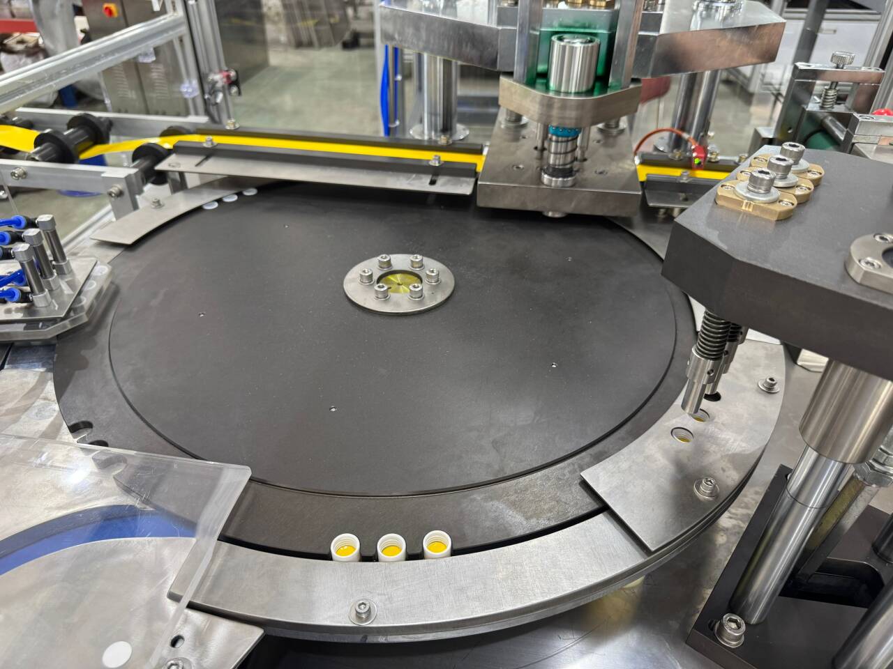 The machine will stop automatically when there is no material feeding: the machine alarms and stops automatically when there is no cap on the cap conveyor belt or when there is no reeled liner material. (Optional)