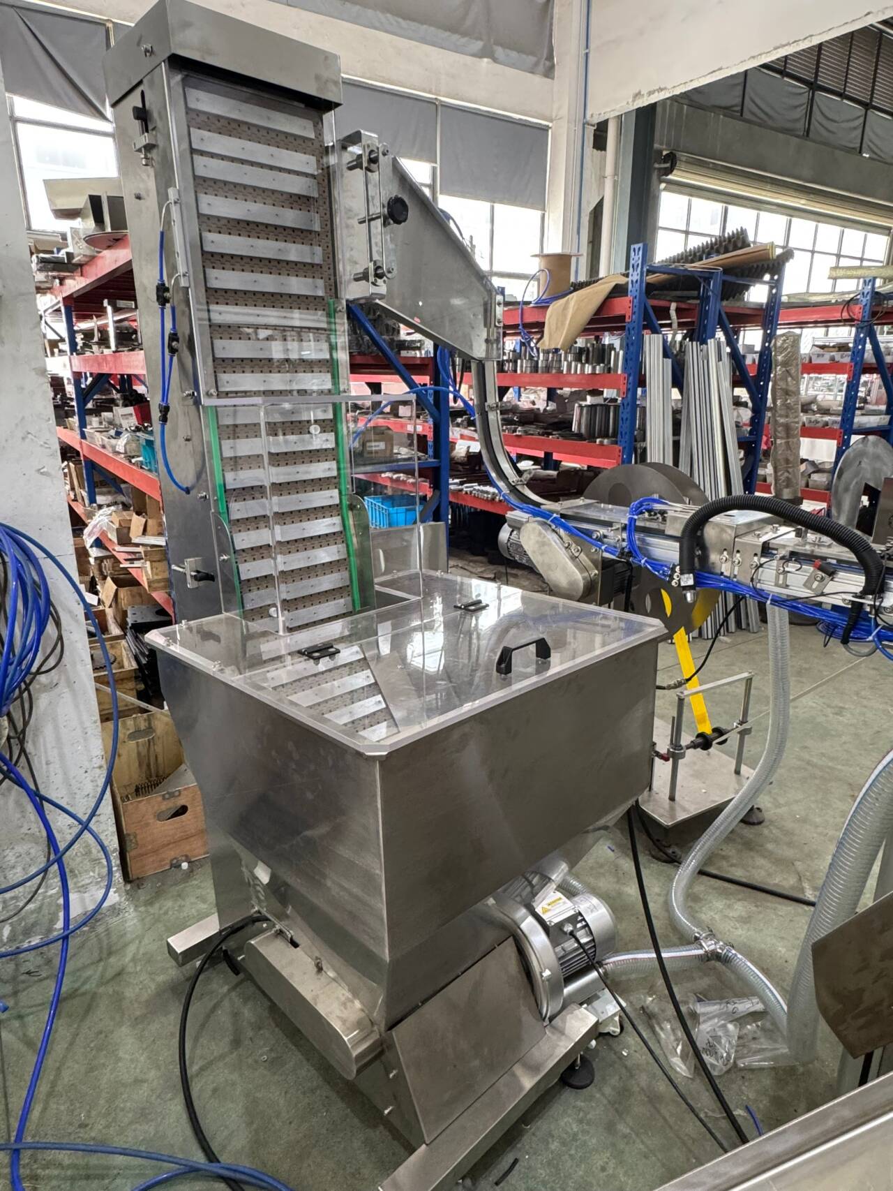 The machine has automatic count function. The machine can stop automatically according to the set number of caps, or an outlet direction converter of conveyor belt can be equipped; when the number of caps reaches that set by the user, the converter will automatically convert the outlet to another box. (Optional)