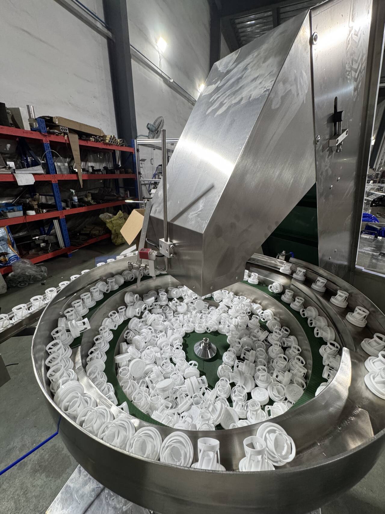 Automatic vibrator feeders for sorting caps to be upwards and feeding caps into conveyor,then taken by indexing plate in the main transmission system.
