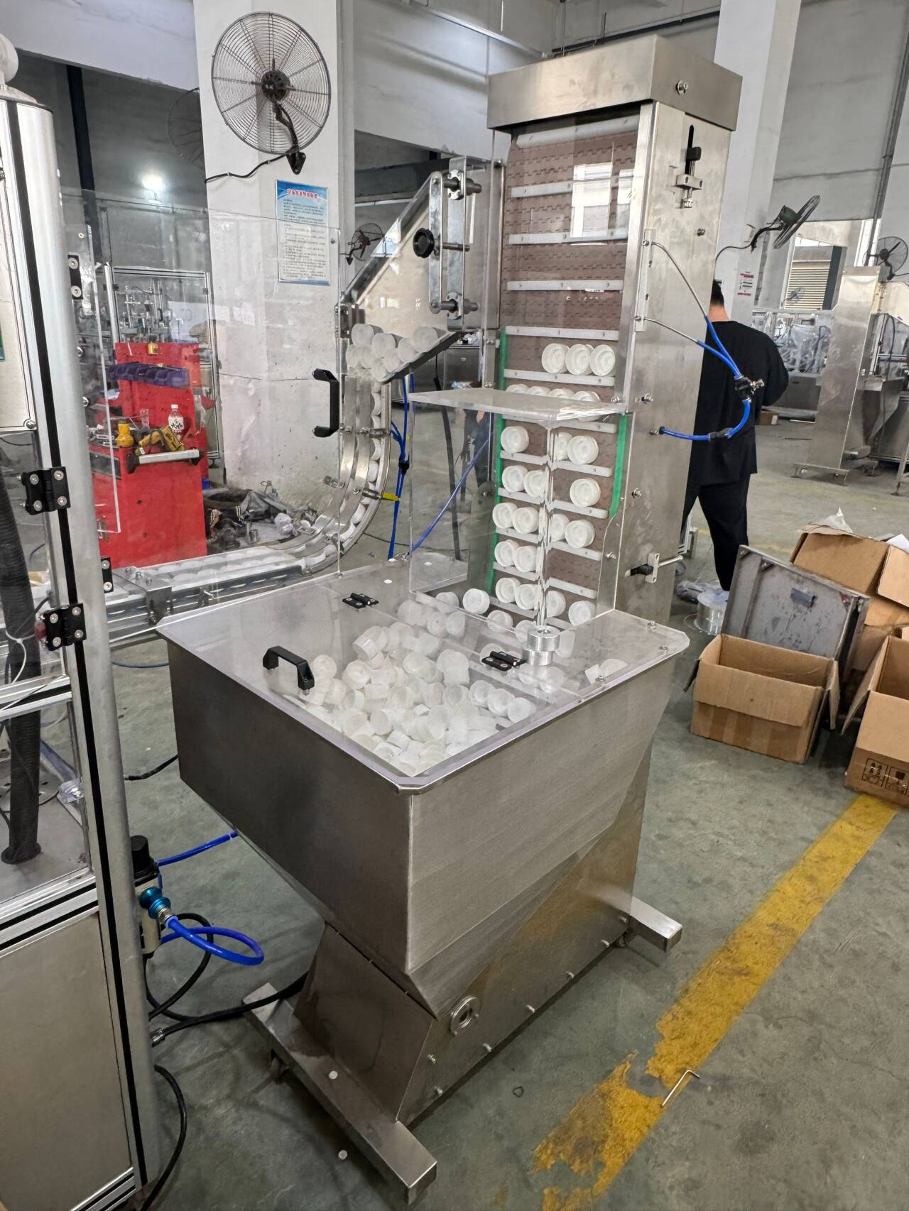 Adopts Auto vibrator sorter and feeder, which can make the dis-ordered caps in order and in correct direction, to ready the caps for main machine.